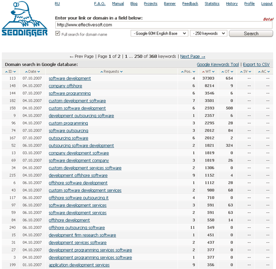 В тематике software development (разработка программного обеспечения) определенных успехов в поисковом продвижении добилась одна из ведущих белорусских аутсорсинговых компаний EffectiveSoft, попробуем выяснить, на какие ключевые слова они ориентируются в своей работе.