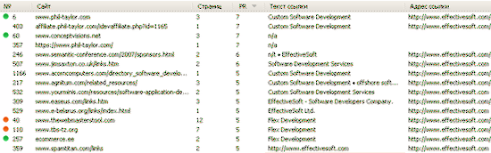 CS Yazzle позволяет посмотреть, какие ключевые слова являются приоритетными для исследуемого проекта (достаточно отсортировать ссылки по полю «Текст ссылки» и сравнить их количество и качество для различных групп запросов), определить, покупает ли проект ссылки и если да, то какие, имеются ли внешние ссылки, которые трудно получить (ссылки с сайтов университетов, государственных организаций, упоминания на новостных сайтах класса New York Times и т.д.).