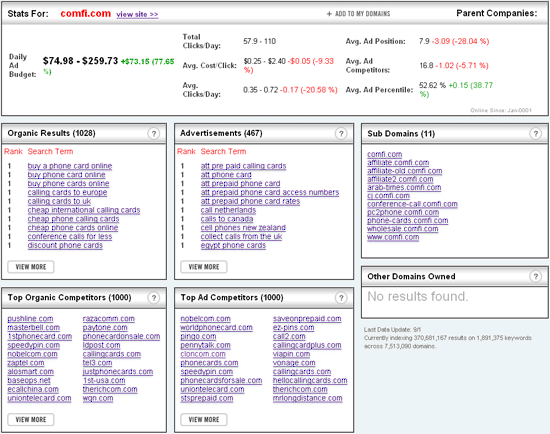 Определить активность конкурента в области контекстной рекламы нам поможет удобный сервис SpyFu. Введя доменное имя, мы получаем, помимо информации о видимости в результатах поиска по запросам (как в SeoDigger), оценочный бюджет и - что нас интересует в первую очередь - перечень ключевых слов, по которым транслируется объявление (за небольшую плату можно получить полный перечень).