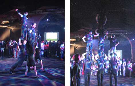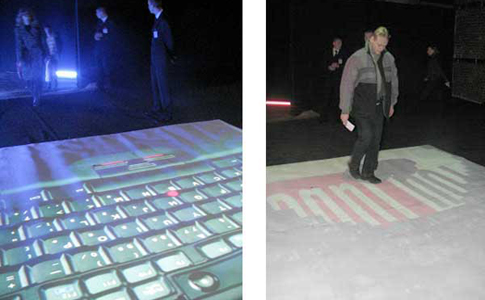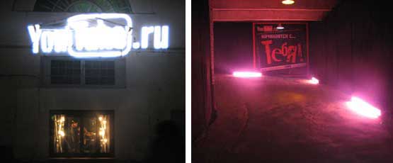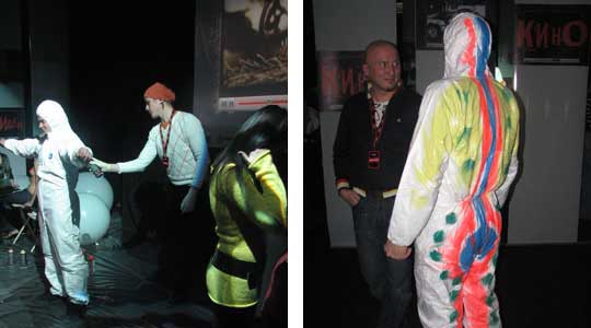 Уже на входе гостей ждала рассыпающаяся под ногами спроецированная клавиатура, каждый новый шаг заставлял буквы и цифры разлетаться в «разные стороны», обнажая яркую надпись YouTube.ru. Сразу после этого навстречу вышла группа в серебристых костюмах, следящая за происходящим вокруг с помощью небольших видеокамер. На протяжении всего вечера эти ребята-аниматоры поддерживали нормальный ход активации творческой энергии всех присутствующих.