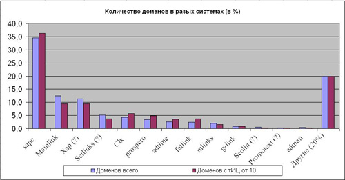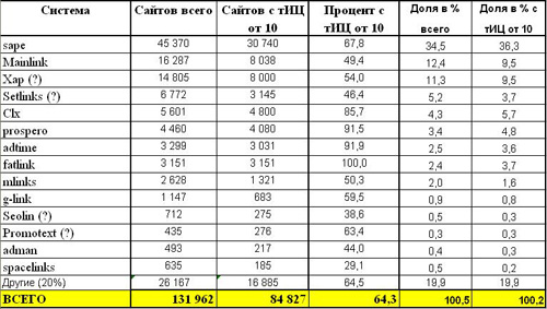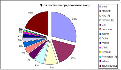 Все, что ниже Mlinks, занимает менее 1%. Вот такова ситуация по мордам. Как мы видим, ситуация по сайтам в целом и по мордам отдельно не сильно отличается. Безусловным лидером с существенным отрывом является Sape. На втором месте идет Mainlink, хотя с ним ситуация весьма неоднозначная. Как видно из таблицы, примерно 40% всех сайтов системы – нулевые (с тИЦ и PR равными 0), что, разумеется, плохо. Система XAP занимает третье место, хотя и имеет свою специфику. Главный недостаток, по мнению веб-мастеров, – это расчеты в условных ксапах, а не реальных деньгах. Да и от рекламодателей частенько можно услышать нарекания. По нашим расчетам, реальная статистика почти вдвое завышена, чем заявленная на главной странице. Полная скрытость статистики, отсутствие предпросмотра и т.д. и т.п… Но! Все это компенсируется чрезвычайно низкими ценами для рекламодателя. А для партнера – практически 100% выкупом рекламы на всех страницах, пускай и по смешным ценам. Это предложение актуально для больших порталов со многими тысячами страниц. Система Setlinks также является достойным игроком на рынке, хотя ее статистика не так прозрачна, но, в целом, система удобная. CLX – старейший брокер- предоставляет наибольшее число услуг. Однако, такие слова как хиты, хосты, CTR, чужды оптимизаторам, поэтому, на мой взгляд, CLX занимает 5 место. Остальные участники имеют свои особенности, но все-таки уступают пятерке лидеров как по удобству, так и по количеству площадок.
