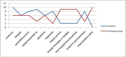 Картина получается классическая для многих продуктов, которые выпускаются на рынок не только в рекламе. Производители продукта или услуги (т.е. в данном случае мы, SEO компании) тратят огромное количество усилий и денег, чтобы конкурировать друг с другом в том, что они считают ценностью для продукта. Например, производители вин стараются обогнать друг друга в изысканности букета, древности марки (все берут пример со старинных виноделов) и специфичности бутылки. Положа руку на сердце, мало кто из нас разбирается в изысканности букетов, чтобы отличить, чем французское красное сухое отличается от красного сухого испанского. Про названия не говорю. На что мы с вами ориентируемся как клиенты? На цену и на вкус вина. Должно быть вкусное. Еще опыт и рекомендации, как всегда со сложным продуктом, в котором мы не очень разбираемся. Понимаете, что получается? Производители вин тратятся на композиции в букете, и конкурировать в этом очень дорого, потому что все стараются превзойти друг друга. А нам, потребителям, этого не надо! То же самое в поисковом продвижении. Мы, производители услуги, изучаем алгоритмы поисковиков, не спим ночами, анализируем принципы текстовой релевантности. Потом объясняем клиенту, почему нужно переделывать сайт, рассказываем, как это важно, чем мы лучше других, а ему этого ВОВСЕ И НЕ НАДО! Ему не нужно, чтобы сайт соответствовал поисковым системам, ему нужны КЛИЕНТЫ!!! Т.о. оптимизаторы где-то совпадают с клиентами в вопросах имиджа, цены и рентабельности и сильно расходятся в ценностях предсказуемость, надежда, лидер рынка и нестандартные решения. Можно не тратить силы на то, чтобы выглядеть лидером рынка, можно не изобретать НЕСТАНДАРТНЫХ решений, если вы даете клиенту рентабельных посетителей в предсказуемом объеме простым способом.