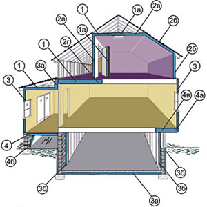 Для того, чтобы дом стал энергосберегающим, его следует правильно теплоизолировать от фундамента до крыши, включая следующие площади: