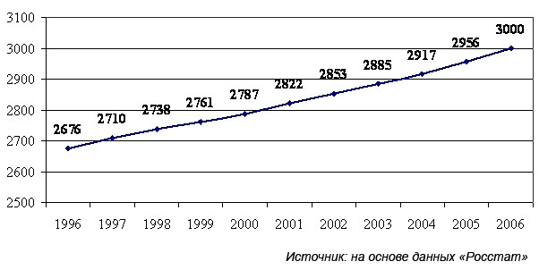 В 2006 году жилищный фонд России оценивается на уровне 3 млрд.кв.м. Жилищный фонд России в период с 1996 года по 2005 год увеличился на 10,5% - с 2676 млн.кв.м. в 1996 год до 2956 млн.кв.м. в 2005 году.
