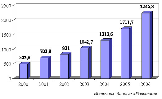 Рост объема подрядных строительных работ в 2000-2006 гг.