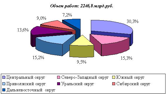 Наибольший объем строительных работ в 2006 году – 30,3%, был выполнен в Центральном федеральном округе России.