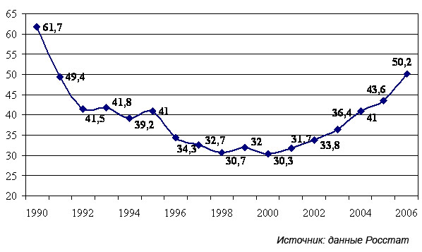 Причем, данное снижение происходило прерывисто - в 1993, 1995, 1999 и 2001 год происходил кратковременный рост объемов жилищного строительства на фоне общего снижения.
