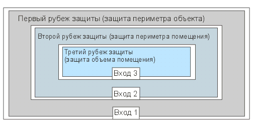 Как правило, при организации системы физической защиты объектов наиболее часто используется трехрубежная схема физической защиты (рис. 2).