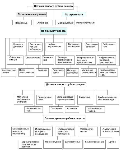 Классификация современных датчиков тревожной сигнализации для обеспечения физической защиты представлена на рис. 3.