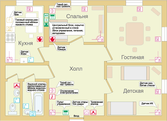 Я уже говорила, что один и тот же датчик в «Интеллектуальном доме» может выполнять несколько функций. Например, тот самый датчик на окне. Если окно открывают, он выключает систему отопления. Ночью (или когда дома никого нет) этот же датчик становится «охранной сигнализацией». Если злоумышленник открыл окно и пытается пробраться в дом, включается режим «Проникновение». Срабатывают системы специального оповещения – сигнальная мигающая лампа, сирена, звонок в милицию и все, что вы захотите запрограммировать для такого неприятного случая.