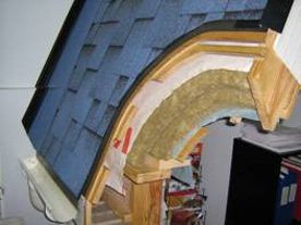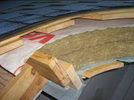 В случае утепления крыши в межстропильное пространство закладывается специальная "начинка" из нескольких слоев. Утеплитель предотвращает потерю тепла через кровлю. Рекомендуется использовать минераловатные плиты с низкой теплопроводностью и плотностью не менее 35кг/м. куб. Общая толщина утепления определяется по эксплуатационным условиям мансардного этажа. Утеплитель укладывается в несколько слоев с перехлестом швов.