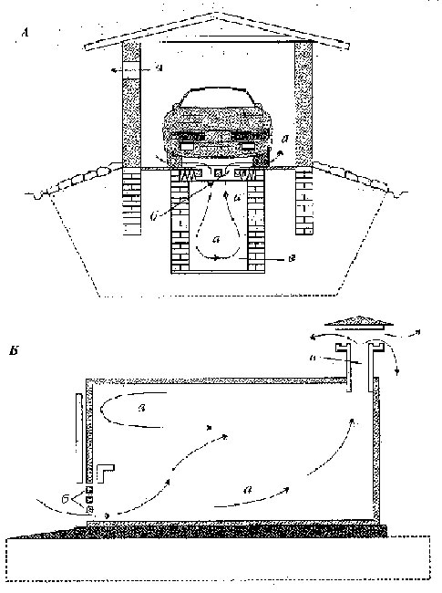 а - направление воздуха; б - вентиляционные отверстия в двери гаража; в - вентиляционный короб.