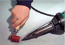 Применение ручного сварочного оборудования требует обязательного использования силиконового или тефлонового прикаточного ролика. Устройство сварного шва производится с помощью специальных насадок (шириной 20 и 40 мм).