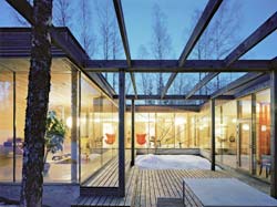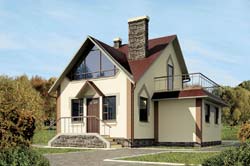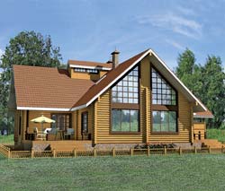 Следующий фаворит трендсеттеров — небольшой дом из бруса с красивым витражом общей площадью 82 кв. м (проект E-1326-0). Такой дом больше всего подойдет для сезонного отдыха семьи, хотя вполне возможно и его круглогодичное использование. К жилой части дома пристроен гараж, крыша которого одновременно является террасой. Подвала в доме нет, небольшой чердак не используется. Запоминающейся деталью в облике дома является витраж мансарды. Его треугольная форма повторяется в рисунке и обрамлении других элементов дома. Небольшое крытое крылечко ведет на первый этаж. Через веранду, которая одновременно играет роль тамбура, можно попасть в гостиную или по лестнице подняться на мансарду. Под крышей расположены две небольшие спальни, летняя комната и ванная. В летней комнате сделано эффективное остекление. Террасу можно использовать как солярий — очень комфортное место отдыха семьи и гостей.