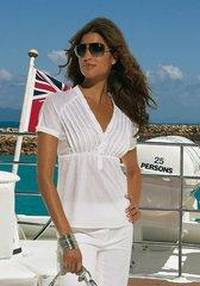 Третий вариант белой блузки с треугольным вырезом и коротким рукавом. Застежка на три пуговицы и простегивающий кант. Рекомендуемая длина - 58-65 см. Белая блузка или туника очень эффектно смотрится на загорелой коже. Собираясь на море , не забудьте положить в чемодан белые вещи.