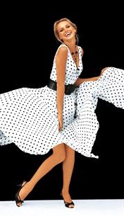 В стиле Мэрилин Монро. В стиле 50 и начала 60. Такое платье не утратило своей актуальности и сегодня. Облегающая фигуру верхняя часть платья с V-образным вырезом как раз для цепочки, колье или бус. Юбка-плиссе.
