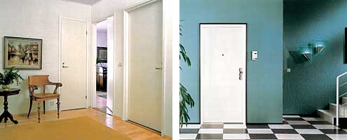 Так вот, внешне специальная дверь не отличается от стандартной. Вся разница - во внутреннем строении. Специальная шумозащитная дверь в разрезе напоминает слоеный пирог. Например, финские двери <Алавус> (Alavus) состоят из двух щитов МДФ, крашенных снаружи, между которыми проложена спрессованная минеральная вата. Уровень звукопоглощения такой двери 30 дБ.