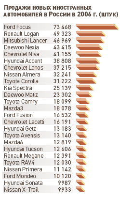 В прошлом году в России продано рекордное число иномарок - более миллиона, что на 65% превышает показатели 2005 года. Рейтинг продаж возглавили Ford Focus, Renault Logan, Mitsubishi Lancer. Завоевать любовь россиян этим моделям помогли не только привлекательное соотношение цены и качества, но и весьма выгодные кредитные программы, предлагаемые Ford и Renault. Помимо "Фокуса", "Логана" и "Лансера" в десятке самых популярных моделей Daewoo Nexia, Chevrolet Niva, Hyundai Accent, Chevrolet Lanos, Nissan Almera, Toyota Corolla и Kia Spectra. В настоящее время все эти авто можно приобрести по специальным, выгодным программам кредитования.
