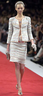 Шанель продолжает радовать нас типичной благовоспитанностью. Шанель - это классика. Модельеры этого дома практически никогда не отходят от своего фирменного стиля. Вафельная фактура, классический белый - все строго и изысканно. Согласитесь, это идеальный вариант для офиса, который тем не менее будет привлекать внимание окружающих. Костюмы Шанель нельзя назвать скучными, потому что в них есть своя изюминка.