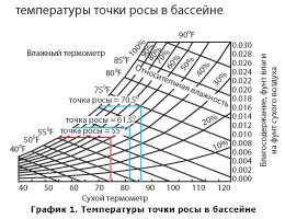 Для поддержания комфортных условий и разумного уровня испарения воды влажность в помещении бассейна должна составлять 50-60%. В таком случае при температуре воздуха 28-30°С температура точки росы находится между 16°С и 21°С (График 1). Это значительно выше, чем в обычных кондиционируемых помещениях, где температура воздуха поддерживается на уровне 24°С, влажность составляет 50%, и точка росы находится на уровне 13°С. В закрытых бассейнах абсолютное влагосодержание воздуха может на 3/4 превышать влагосодержание в обычных кондиционируемых помещениях. Проектировщик должен учесть это и принять меры для уменьшения конденсации влаги на поверхностях ограждающих конструкций.