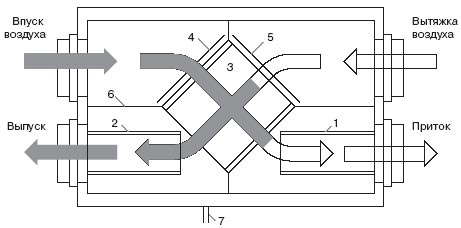 Для выполнения этих норм, а также для улучшения воздухообмена, в жилых домах необходимо устройство организованной приточно-вытяжной вентиляции. Для ее устройства разработаны и широко используются эффективные противоточные агрегаты с рекуператорами теплоты, в которых наружный приточный воздух подогревается за счет теплоты уходящего вытяжного воздуха (рис. 1).
