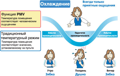Во-вторых, функция PMV корректирует микроклимат в помещении в соответствии с изменением температуры на улице, что приносит до 20 % экономии: кондиционер работает плавно, без перегрузок.