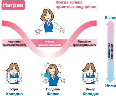 Изменение температуры в помещении в течение дня при отсутствии и при наличии функции PMV (Predicated Mean Vote)
