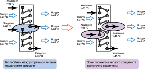 Конструктивные особенности теплообменника U-образной формы наружного блока: а) традиционное соединение секций, б) с разнесением трубопроводов соседних секций