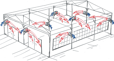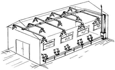 Используя тот же принцип отопления за счет газовых теплогенераторов или теплообменников, можно отапливать, вентилировать и кондиционировать помещения различного назначения. Наиболее эффективно это решается в помещениях с большим внутренним объемом: торговые центры, спортивные сооружения, склады, производственные цеха и т.д. Примерная схема такого отопления представлена на рис. 4, 5.