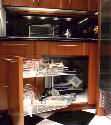 Важным моментом при выборе отдельных кухонных составляющих является удобство в эксплуатации, так называемая эргономичность. Для этого следует удачно спланировать полки, выбрать ящики с удобной системой максимального выдвижения, угловые полки-карусели для того, чтобы рационально использовать всю полезную площадь кухни. Но помните, что чем сложнее "начинка" у шкафов, тем они дороже.