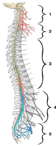 1 - шейное сплетение; 2 - плечевое сплетение; 3 - межреберные нервы; 4 - поясничное сплетение; 5 - крестцовое сплетение