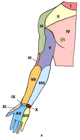 I - надлопаточный нерв; II - латеральный кожный нерв предплечья; III - латеральные кожные ветви грудных нервов; IV - медиальный кожный нерв плеча; V - задний кожный нерв плеча; VI - боковые кожные ветви межреберных нервов; VII - медиальные кожные ветви грудных нервов; VIII - ветви поясничных нервов; IX - медиальные кожные ветви крестцовых нервов; X - латеральная кожная ветвь подвздошно-подчревного нерва; XI - латеральный кожный нерв бедра; XII - ветви заднего кожного нерва бедра