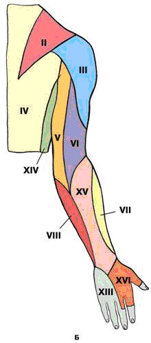 А - ладонная поверхность; Б - тыльная поверхность: I - поперечный нерв шеи; II - подключичные нервы; III - латеральный кожный нерв предплечья; IV - ветви грудных нервов; V - медиальный кожный нерв плеча; VI - задний кожный нерв плеча; VII - латеральный кожный нерв предплечья;