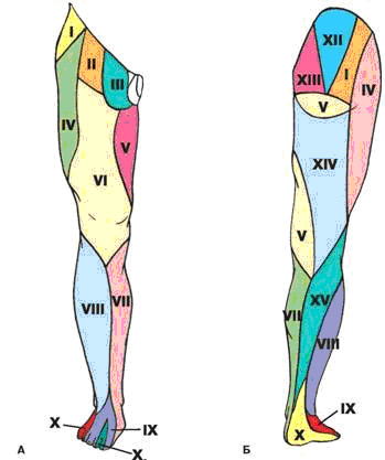 А - передняя поверхность; Б - задняя поверхность: I - латеральная кожная ветвь подвздошно-подчревного нерва; II - ветви полово-бедренного нерва; III - подвздошно-паховый нерв; IV - латеральный кожный нерв бедра; V - кожная ветвь запирательного нерва; VI - передний кожный нерв бедра; VII - ветви подкожного нерва; VIII - ветви общего малоберцового нерва; IX - ветви поверхностного малоберцового нерва; X - ветви икроножного нерва; XI - ветви глубокого малоберцового нерва; XII - ветви поясничных нервов; XIII - медиальные кожные ветви крестцовых нервов; XIV - задний кожный нерв бедра; XV - ветви большеберцового нерва