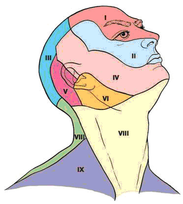 I - ветви лобного, глазничного и тройничного нервов; II - ветви скулового, подглазничного, верхнечелюстного и тройничного нервов; III - ветви большого затылочного нерва; IV - ветви ушно-затылочного, подбородочного, нижнечелюстного и тройничного нервов; V - ветви малого затылочного нерва; VI - ветви большого ушного нерва; VII - подкожные ветви дорсального нерва лопатки; VIII - поперечный нерв шеи; IX - надключичные нервы