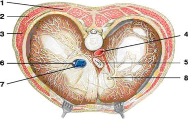 1 - мышца, поднимающая позвоночник; 2 - наружная косая мышца живота; 3 - внутренняя косая мышца живота; 4 - грудная аорта; 5 - пищевод; 6 - правый диафрагмальный нерв; 7 - нижняя полая вена; 8 - левый диафрагмальный нерв