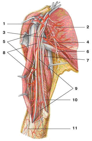 1 - латеральный грудной нерв; 2 - подлопаточный нерв; 3 - подкрыльцовый нерв; 4 - грудоспинной нерв; 5 - мышечно-кожный нерв; 6 - медиальный кожный нерв плеча; 7 - лучевой нерв; 8 - срединный нерв; 9 - медиальный кожный нерв предплечья; 10 - локтевой нерв; 11 - латеральный кожный нерв предплечья