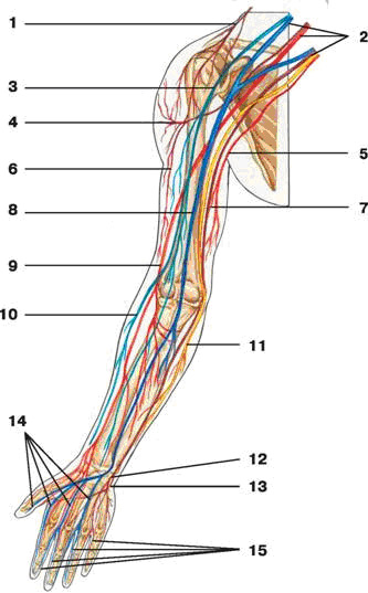 1 - надключичный нерв; 2 - плечевое сплетение; 3 - мышечно-кожный нерв; 4 - подкрыльцовый нерв; 5 - медиальный кожный нерв плеча; 6 - латеральный кожный нерв плеча; 7 - локтевой нерв; 8 - срединный нерв; 9 - лучевой нерв; 10 - латеральный кожный нерв предплечья; 11 - медиальный кожный нерв предплечья; 12 - поверхностная ветвь локтевого нерва; 13 - глубокая ветвь локтевого нерва; 14 - общие ладонные пальцевые нервы; 15 - собственные ладонные пальцевые нервы