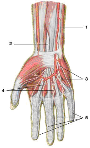 1 - локтевой нерв; 2 - срединный нерв; 3 - поверхностные ветви локтевого нерва; 4 - общие ладонные пальцевые нервы; 5 - собственные ладонные пальцевые нервы