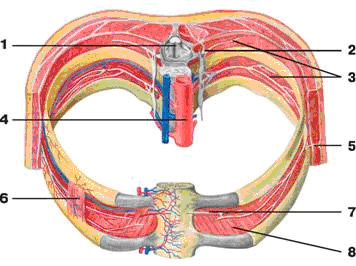 1 - спинной мозг; 2 - спинно-мозговой нерв; 3 - центральные межреберные нервы; 4 - грудная аорта; 5 - латеральная кожная грудная ветвь; 6 - наружная межреберная мышца; 7 - передняя кожная грудная ветвь; 8 - внутренняя межреберная мышца