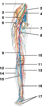 1 - подвздошно-подчревный нерв; 2 - запирательный нерв; 3 - подвздошно-паховый нерв; 4 - бедренный нерв; 5 - полово-бедренный нерв; 6 - латеральный кожный нерв бедра; 7 - седалищный нерв; 8 - задний кожный нерв бедра; 9 - общий малоберцовый нерв; 10 - большеберцовый нерв; 11 - медиальный кожный нерв икры; 12 - глубокий малоберцовый нерв; 13 - подкожный нерв; 14 - поверхностный малоберцовый нерв; 15 - латеральный кожный нерв икры; 16 - икроножный нерв; 17 - медиальная и латеральная подошвенные ветви