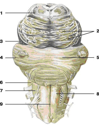 1 - верхняя ножка мозжечка; 2 - пирамидный тракт; 3 - ножка конечного мозга; 4 - средняя ножка мозжечка; 5 - мост; 6 - нижняя ножка мозжечка; 7 - олива; 8 - пирамида; 9 - передняя срединная щель
