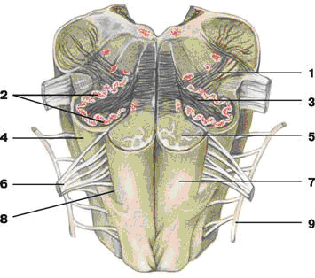 1 - оливомозжечковый тракт; 2 - ядро оливы; 3 - ворота ядра оливы; 4 - олива; 5 - пирамидный тракт; 6 - подъязычный нерв; 7 - пирамида; 8 - передняя боковая борозда; 9 - добавочный нерв Волокна подъязычного нерва (рис. 259) уходят в толщу продолговатого мозга и хорошо видны на поперечных разрезах. Подъязычный нерв разделяет поперечник на боковые отделы и средние отделы, где располагается проводниковый аппарат, пучки которого образуют пирамиды. Кзади от пирамид залегают проводники суставно-мышечного чувства, представляющие собой отростки клеток, образующих тонкое и клиновидное ядра. Отростки направляются вверх, перекрещиваются друг с другом и называются волокнами медиальной петли. Боковые отделы содержат ядра олив, имеющих зазубренную форму, и волокна, опускающиеся ниже ножки мозжечка и соединяющие его с продолговатым мозгом. Вестибулярные ядра (VIII пары), черепные нервы (IX и X пары) и диффузно рассеянные нейроны ретикулярной формации на срезе не видны, но также содержатся в боковых отделах. Они отвечают за рефлекторные функции, например рефлекс равновесия, глотательный, сосательный, дыхательные и сердечно-сосудистые рефлексы, а также защитные (кашель, чиханье и др.).