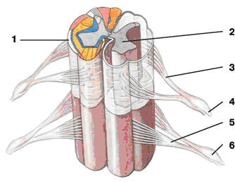1 - задний канатик; 2 - задний рог; 3 - боковой канатик; 4 - центральный канал; 5 - белая спайка; 6 - передний рог; 7 - передний канатик Помимо проводниковой функции, спинной мозг отвечает за рефлекторную деятельность (например, сухожильный коленный рефлекс). При его помощи происходит замыкание рефлекторных дуг на уровне соответствующих сегментов. Передние канатики, находящиеся между передними столбами серого вещества, вместе с боковыми канатиками, залегающими между передними и задними столбами, содержат проводники двух видов: восходящие проводники направляются к различным отделам центральной нервной системы (ЦНС); нисходящие проводники идут от различных образований ЦНС к двигательным клеткам спинного мозга. Задние канатики располагаются между задними столбами и содержат восходящие проводники, направляющиеся к коре полушарий головного мозга и отвечающие за осознанную оценку положения тела в пространстве, то есть за суставно-мышечное чувство.