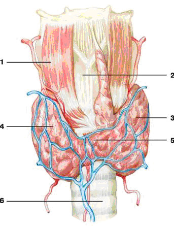 1 - щитовидно-подъязычная мышца; 2 - щитовидный хрящ; 3 - левая доля щитовидной железы; 4 - правая доля щитовидной железы; 5 - перешеек щитовидной железы; 6 - трахея