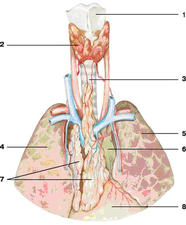 1 - щитовидный хрящ; 2 - щитовидная железа; 3 - трахея; 4 - правое легкое; 5 - левое легкое; 6 - аорта; 7 - вилочковая железа; 8 - околосердечная сумка