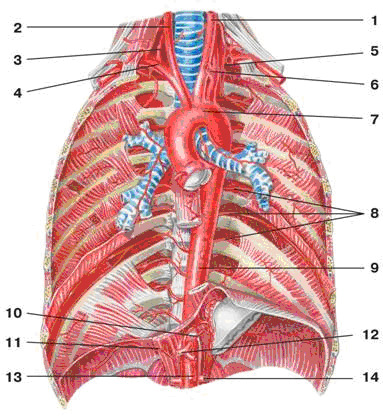 1 - левая общая сонная артерия; 2 - правая общая сонная артерия; 3 - позвоночная артерия; 4 - правая подключичная артерия; 5 - наивысшая межреберная артерия; 6 - левая подключичная артерия; 7 - дуга аорты; 8 - межреберные артерии; 9 - аорта; 10 - левая желудочная артерия; 11 - нижняя диафрагмальная артерия; 12 - общая печеночная артерия; 13 - верхняя брыжеечная артерия; 14 - почечная артерия