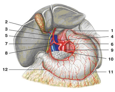 1 - левая ветвь собственной печеночной артерии; 2 - правая ветвь собственной печеночной артерии; 3 - собственная печеночная артерия; 4 - нижняя диафрагмальная артерия; 5 - правая желудочная артерия; 6 - левая желудочная артерия; 7 - желудочно-двенадцатиперстнокишечная артерия; 8 - общая печеночная артерия; 9 - брюшная аорта; 10 - селезеночная артерия; 11 - левая желудочно-сальниковая артерия; 12 - правая желудочно-сальниковая артерия