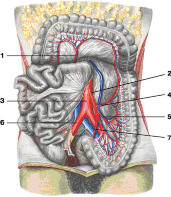 1 - средняя ободочно-кишечная артерия; 2 - нижняя брыжеечная артерия; 3 - брюшная аорта; 4 - левая ободочно-кишечная артерия; 5 - сигмовидно-кишечная артерия; 6 - общая подвздошная артерия; 7 - верхняя прямокишечная артерия