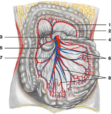 1 - анастомоз между левой и средней ободочно-кишечными артериями; 2 - левая ободочно-кишечная артерия; 3 - средняя ободочно-кишечная артерия; 4 - верхняя брыжеечная артерия; 5 - правая ободочно-кишечная артерия; 6 - толстокишечные артерии; 7 - подвздошно-ободочно-кишечная артерия; 8 - подвздошно-кишечная артерия